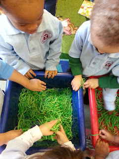 The childen strenghtened their fine motor skills by using tongs to pick up green and yellow rice in the sensory table.